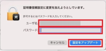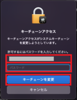 ご使用端末の管理者ユーザ名とパスワードを入力し,『キーチェーンを変更』をクリックします