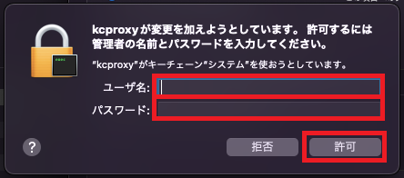 ご使用端末の管理者ユーザ名とパスワードを入力し,『許可』をクリックします。