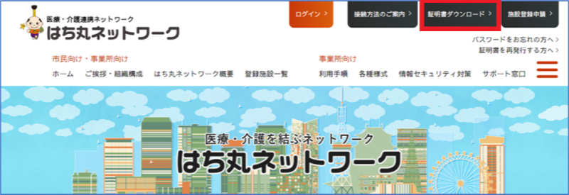 はち丸ネットワークホームページの『証明書ダウンロード』をクリックします。