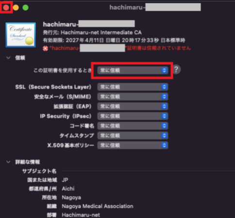 この証明書を使用するときの項目を『常に信頼』に変更し,左上の赤いボタンをクリックします。