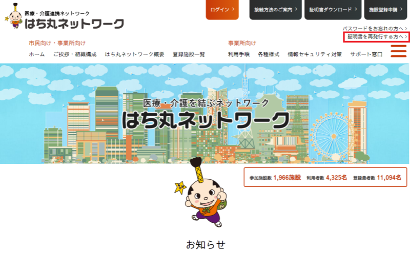 はち丸ネットワークホームページの『証明書を再発行する方へ』を選択します。